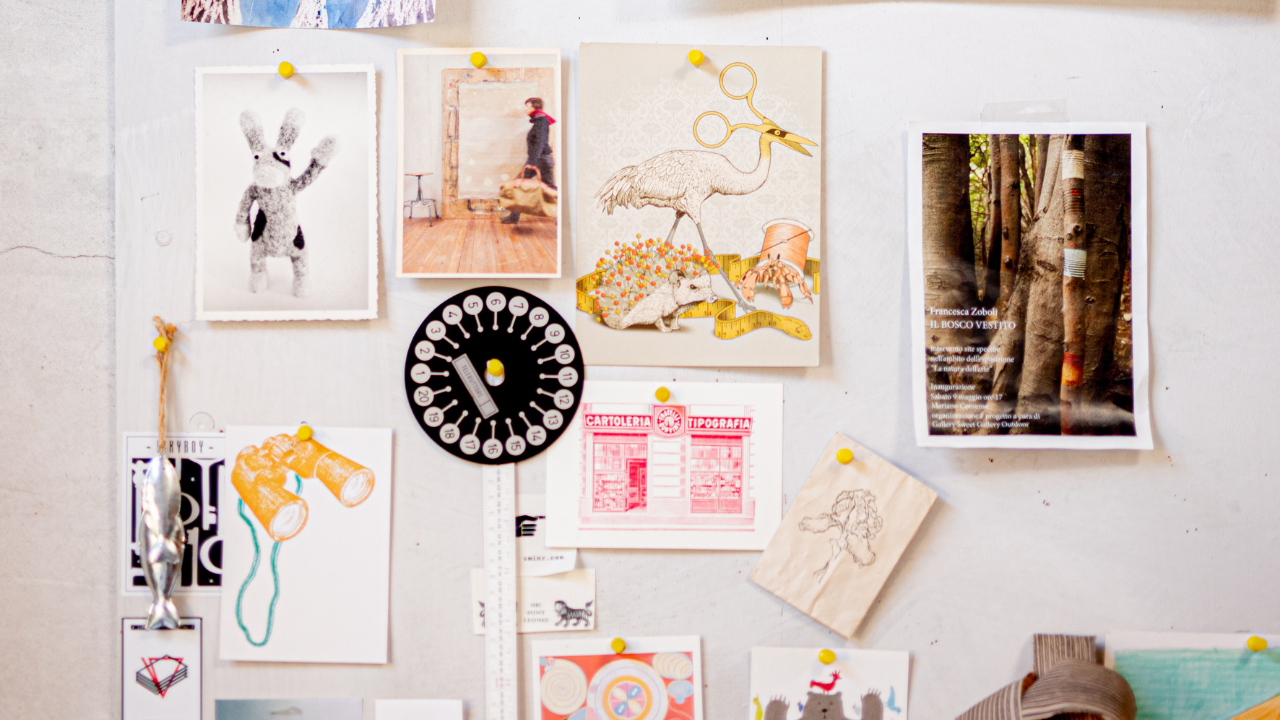 A moodboard (or inspiration board) is a visual collage that helps creatives focus on certain visual cues or styles for a given project. They are commonly used by artists like graphic designers, photographers, and interior designers who require a focussed aesthetic for the operation of their profession. While a visual artist would fill their moodboard with images, colours, and textures — a writer could build one focussed on text, called a voice moodboard.