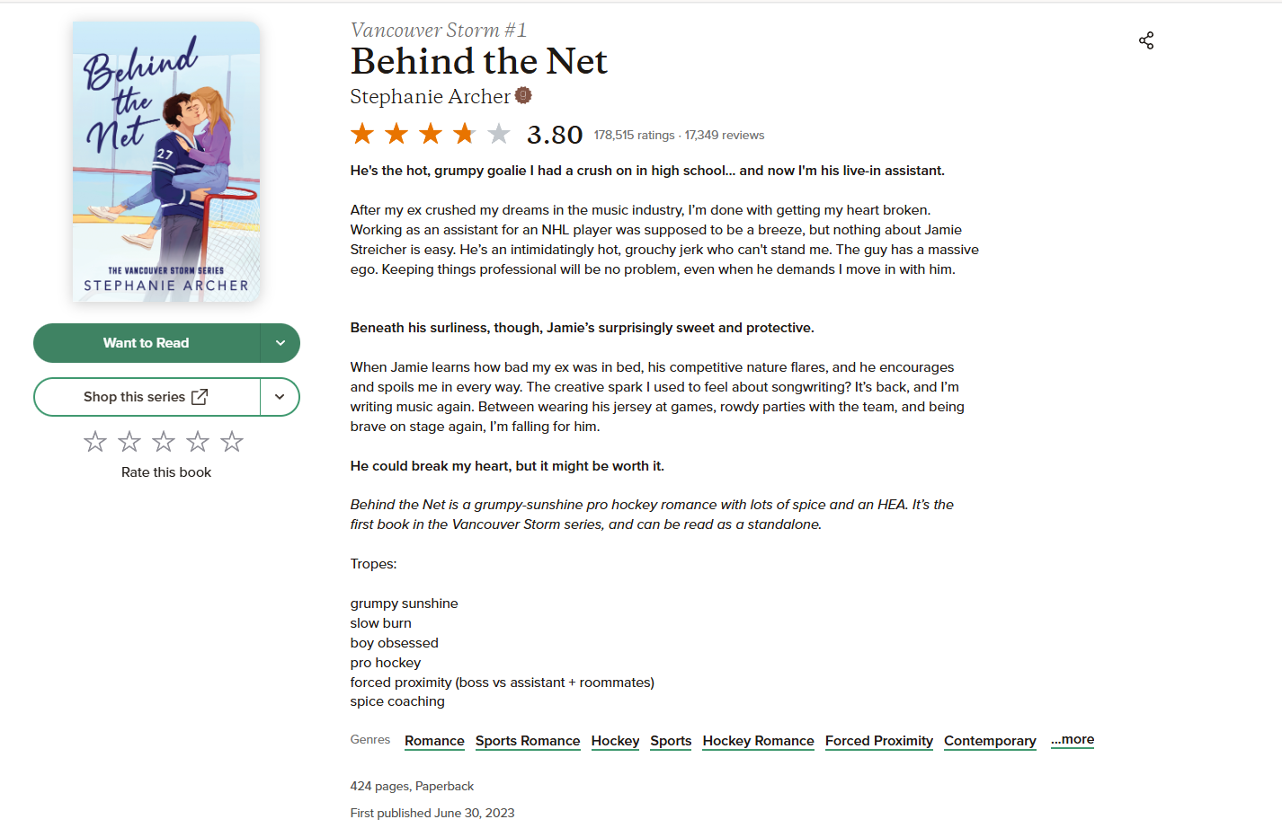 An example of this is established Canadian author Stephanie Archer, who includes a list of tropes for her books in her Vancouver Storm series on their Goodreads pages (e.g. Behind the Net):