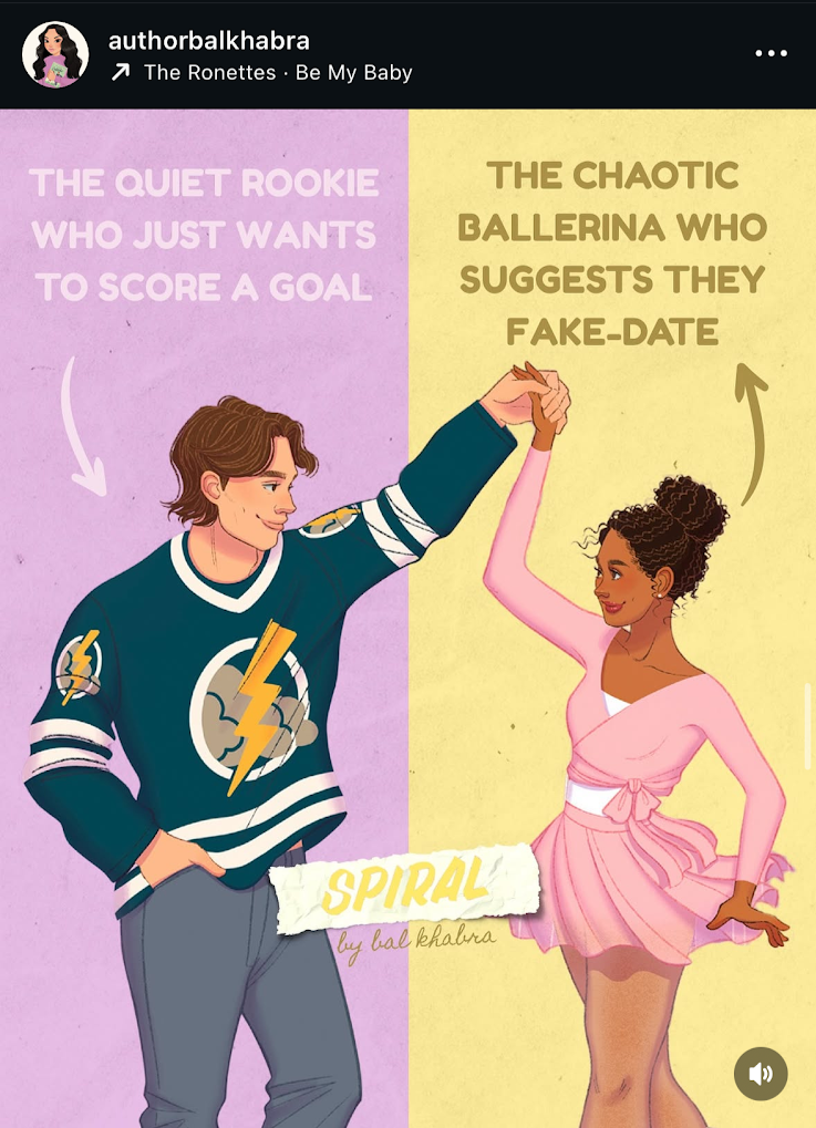 Your tropes can also be used in your caption of a social media post that highlights a different aspect of your book, like a snippet of dialogue between the love interests or character art. For example, Bal Khabra (Canadian author of the ‘Off The Ice’ series) shared the tropes for Spiral in a past post. The caption (below) was paired with an image of the characters and a quick blurb about both of them. This multimedia approach offers a variety of “hooks” to catch someone on their daily scroll.