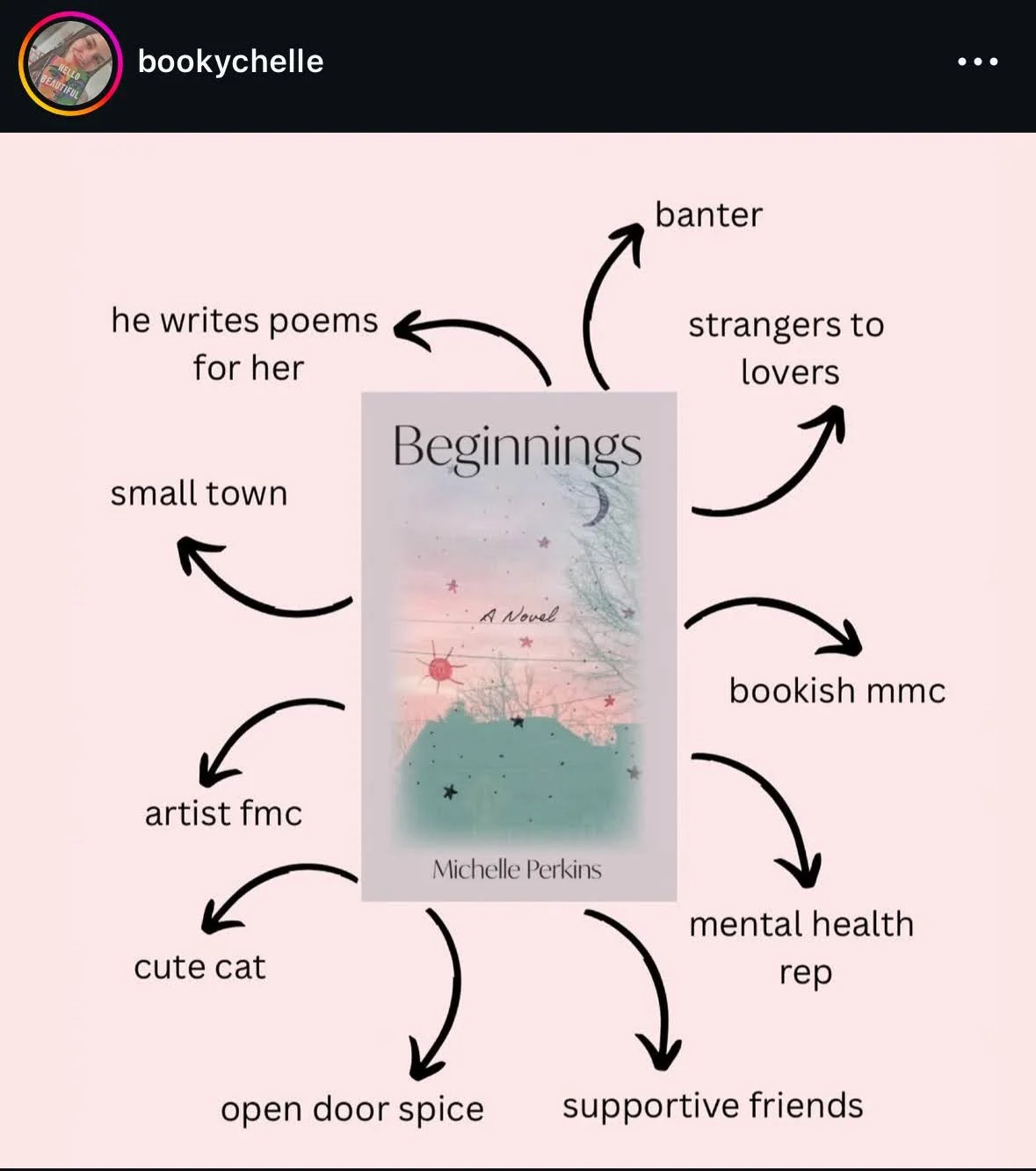 One example of utilizing tropes in a photo post comes from FriesenPress author, Michelle Perkins, who recently published her romance novel Beginnings and highlighted her book’s tropes in an introductory post on her @bookychelle Instagram. The tropes alongside the cover take center stage of the post and give viewers a vivid glimpse into the book before they’ve even read the caption.